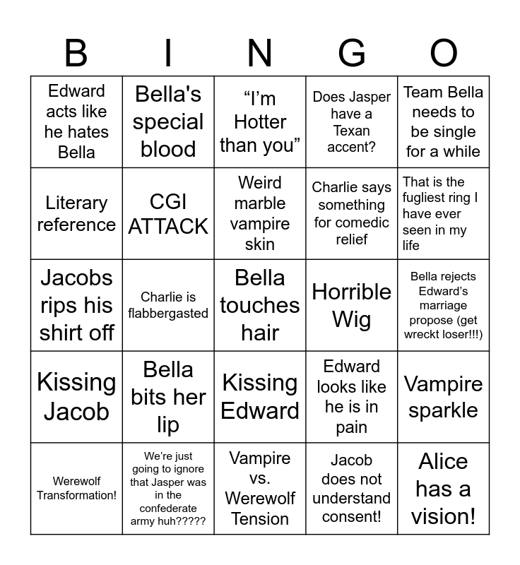 This bingo card has a free space and 29 words: Werewolf Transformation!, PP measuring contest between vampires and werewolves, Charlie is flabbergasted, Vampire Fight Stance, Edward acts like he hates Bella, “I’m Hotter than you”, CGI ATTACK, Bella bits her lip, Horrible Wig, We’re just going to ignore that Jasper was in the confederate army huh?????, Bella rejects Edward’s marriage propose (get wreckt loser!!!), Alice has a vision!, Vampire vs. Werewolf Tension, Jacob does not understand consent!, That is the fugliest ring I have ever seen in my life, A wild ginger appears, Kissing Edward, Kissing Jacob, Team Bella needs to be single for a while, Jacobs rips his shirt off, Edward looks like he is in pain, Bella makes a weird choking noise, Charlie says something for comedic relief, Literary reference, Does Jasper have a Texan accent?, Bella's special blood, Vampire sparkle, Weird marble vampire skin and Poor Riley :(.