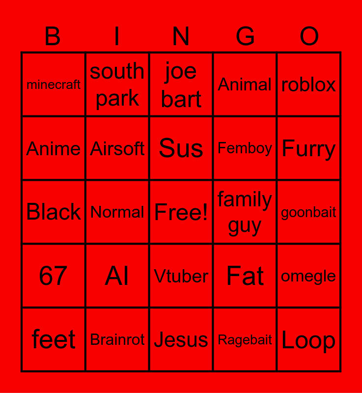 This bingo card has a free space and 24 words: AI, Brainrot, Sus, feet, roblox, minecraft, Anime, south park, family guy, Vtuber, Femboy, Black, Fat, omegle, Airsoft, Ragebait, goonbait, joe bart, Furry, Normal, Loop, 67, Animal and Jesus.