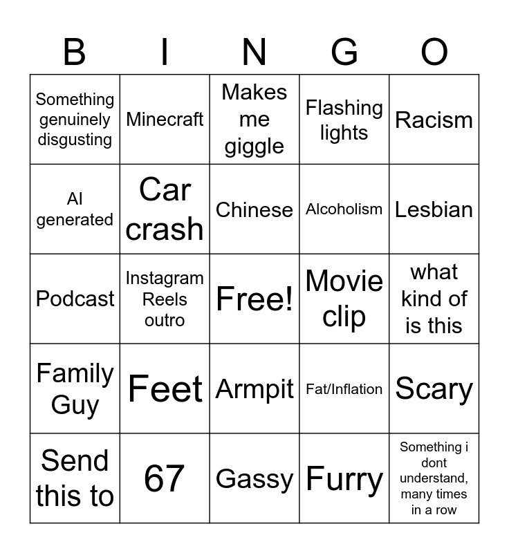 This bingo card has a free space and 24 words: Feet, 67, Chinese, Send this to, Racism, Something genuinely disgusting, AI generated, Minecraft, Movie clip, Armpit, Alcoholism, Podcast, Fat/Inflation, Scary, Car crash, Furry, what kind of is this, Makes me giggle, Lesbian, Instagram Reels outro, Something i dont understand, many times in a row, Family Guy, Flashing lights and Gassy.