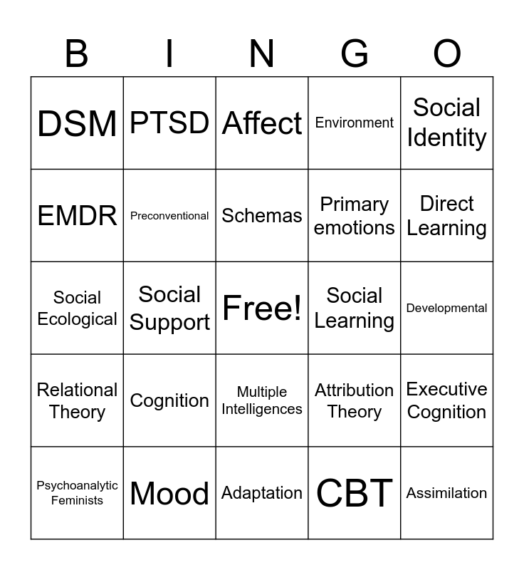 This bingo card has a free space and 24 words: Cognition, Mood, Schemas, Psychoanalytic Feminists, Social Identity, DSM, EMDR, PTSD, Social Learning, Multiple Intelligences, Primary emotions, Social Ecological, Attribution Theory, Executive Cognition, Preconventional, CBT, Developmental, Affect, Direct Learning, Social Support, Assimilation, Relational Theory, Environment and Adaptation.