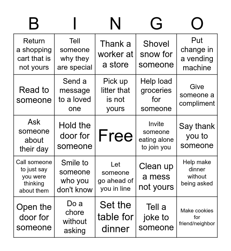 This bingo card has a free space and 24 words: Smile to someone who you don't know, Do a chore without asking, Pick up litter that is not yours, Open the door for someone, Put change in a vending machine, Return a shopping cart that is not yours, Read to someone, Tell someone why they are special, Invite someone eating alone to join you, Let someone go ahead of you in line, Help load groceries for someone, Ask someone about their day, Clean up a mess not yours, Help make dinner without being asked, Send a message to a loved one, Tell a joke to someone, Say thank you to someone, Thank a worker at a store, Give someone a compliment, Hold the door for someone, Make cookies for friend/neighbor, Call someone to just say you were thinking about them, Shovel snow for someone and Set the table for dinner.