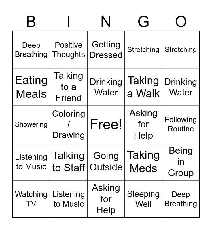 This bingo card has a free space and 24 words: Talking to Staff, Listening to Music, Drinking Water, Watching TV, Stretching, Deep Breathing, Eating Meals, Positive Thoughts, Asking for Help, Going Outside, Taking a Walk, Showering, Taking Meds, Being in Group, Talking to a Friend, Sleeping Well, Following Routine, Getting Dressed, Drinking Water, Coloring / Drawing, Deep Breathing, Listening to Music, Stretching and Asking for Help.