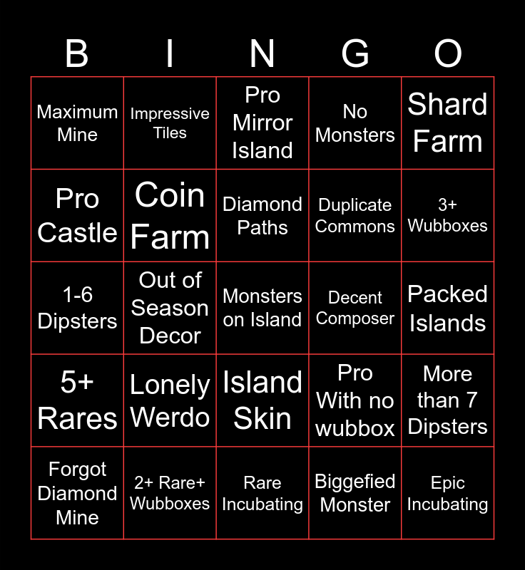 This bingo card has a free space and 34 words: Glowbes, Biggefied Monster, 3+ Costumes, 3+ Epics, 5+ Rares, Coin Farm, Shard Farm, Forgot Diamond Mine, Impressive Tiles, Double Nursury & Breeder, Diamond Paths, Pro Mirror Island, All Muted, starter island, Decent Composer, 3+ Wubboxes, 2+ Rare+ Wubboxes, 1-6 Dipsters, Lonely Werdo, Pro With no wubbox, Island Skin, Has 1-9 Torches, Maximum Mine, Packed Islands, Rare Incubating, Epic Incubating, No Monsters, 3+ Blue Torches, Duplicate Commons, Pro Castle, Forgot Torches, Out of Season Decor, More than 7 Dipsters and Torch Lit :D.