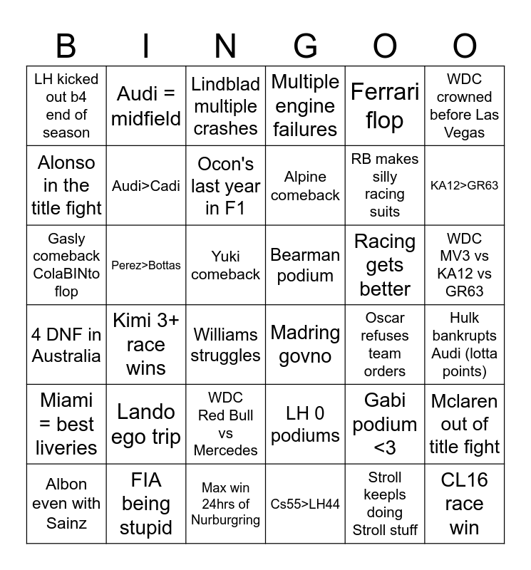 This bingo card has 36 words: LH 0 podiums, WDC Red Bull vs Mercedes, Cs55>LH44, Alonso in the title fight, 4 DNF in Australia, Bearman podium, Audi>Cadi, Max win 24hrs of Nurburgring, Ferrari flop, Gabi podium <3, KA12>GR63, Multiple engine failures, Mclaren out of title fight, Perez>Bottas, Alpine comeback, LH kicked out b4 end of season, Miami = best liveries, Racing gets better, Gasly comeback ColaBINto flop, Lindblad multiple crashes, Yuki comeback, Kimi 3+ race wins, Madring govno, Williams struggles, Oscar refuses team orders, Audi = midfield, RB makes silly racing suits, FIA being stupid, Ocon's last year in F1, WDC crowned before Las Vegas, CL16 race win, Albon even with Sainz, Hulk bankrupts Audi (lotta points), WDC MV3 vs KA12 vs GR63, Lando ego trip and Stroll keepls doing Stroll stuff.
