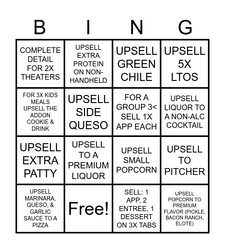 This bingo card has 16 words: Free!, UPSELL TO PITCHER, UPSELL GREEN CHILE, COMPLETE DETAIL FOR 2X THEATERS, UPSELL EXTRA PATTY, UPSELL EXTRA PROTEIN ON NON-HANDHELD, UPSELL SMALL POPCORN, SELL: 1 APP, 2 ENTREE, 1 DESSERT ON 3X TABS, FOR 3X KIDS MEALS UPSELL THE ADDON COOKIE & DRINK, UPSELL SIDE QUESO, UPSELL MARINARA, QUESO, & GARLIC SAUCE TO A PIZZA, UPSELL 5X LTOS, UPSELL TO A PREMIUM LIQUOR, UPSELL LIQUOR TO A NON-ALC COCKTAIL, FOR A GROUP 3< SELL 1X APP EACH and UPSELL POPCORN TO PREMIUM FLAVOR (PICKLE, BACON RANCH, ELOTE).