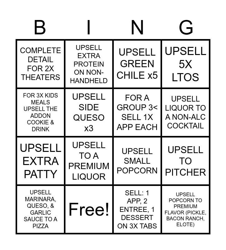 This bingo card has 16 words: Free!, UPSELL TO PITCHER, UPSELL GREEN CHILE x5, COMPLETE DETAIL FOR 2X THEATERS, UPSELL EXTRA PATTY, UPSELL EXTRA PROTEIN ON NON-HANDHELD, UPSELL SMALL POPCORN, SELL: 1 APP, 2 ENTREE, 1 DESSERT ON 3X TABS, FOR 3X KIDS MEALS UPSELL THE ADDON COOKIE & DRINK, UPSELL SIDE QUESO x3, UPSELL MARINARA, QUESO, & GARLIC SAUCE TO A PIZZA, UPSELL 5X LTOS, UPSELL TO A PREMIUM LIQUOR, UPSELL LIQUOR TO A NON-ALC COCKTAIL, FOR A GROUP 3< SELL 1X APP EACH and UPSELL POPCORN TO PREMIUM FLAVOR (PICKLE, BACON RANCH, ELOTE).