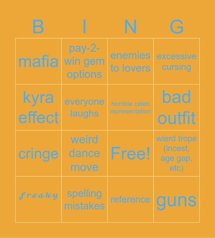 This bingo card has 16 words: spelling mistakes, wierd trope (incest, age gap, etc), enemies to lovers, mafia, cringe, pay-2-win gem options, Free!, reference, kyra effect, everyone laughs, 𝓯𝓻𝓮𝓪𝓴𝔂, excessive cursing, weird dance move, bad outfit, horrible celeb representation and guns.