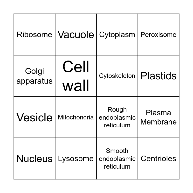 This bingo card has 16 words: Lysosome, Plasma Membrane, Cytoplasm, Ribosome, Vesicle, Vacuole, Rough endoplasmic reticulum, Smooth endoplasmic reticulum, Golgi apparatus, Cell wall, Nucleus, Peroxisome, Mitochondria, Plastids, Cytoskeleton and Centrioles.
