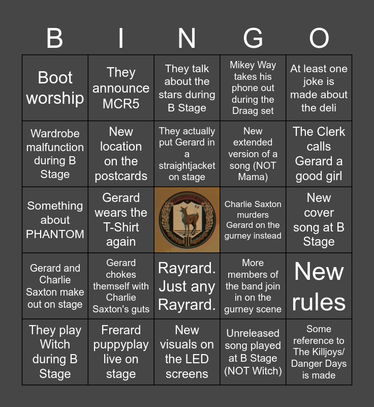This bingo card has a free space and 24 words: Gerard chokes themself with Charlie Saxton's guts, Frerard puppyplay live on stage, They actually put Gerard in a straightjacket on stage, They play Witch during B Stage, At least one joke is made about the deli, Boot worship, Wardrobe malfunction during B Stage, They announce MCR5, Charlie Saxton murders Gerard on the gurney instead, Rayrard. Just any Rayrard., New extended version of a song (NOT Mama), Something about PHANTOM, More members of the band join in on the gurney scene, New rules, New location on the postcards, Unreleased song played at B Stage (NOT Witch), New cover song at B Stage, They talk about the stars during B Stage, The Clerk calls Gerard a good girl, Gerard wears the T-Shirt again, Some reference to The Killjoys/ Danger Days is made, Gerard and Charlie Saxton make out on stage, Mikey Way takes his phone out during the Draag set and New visuals on the LED screens.