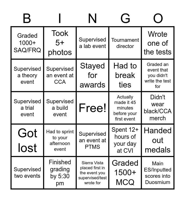 This bingo card has a free space and 24 words: Had to sprint to your afternoon event, Finished grading by 5:30 pm, Stayed for awards, Supervised two events, Wrote one of the tests, Graded 1000+ SAQ/FRQ, Supervised a theory event, Took 5+ photos, Actually made it 45 minutes before your first event, Supervised an event at PTMS, Had to break ties, Supervised a trial event, Spent 12+ hours of your day at CVI, Handed out medals, Supervised an event at CCA, Graded 1500+ MCQ, Didn't wear black/CCA merch, Supervised a lab event, Graded an event that you didn't write the test for, Supervised a build event, Main ES/Inputted scores into Duosmium, Got lost, Tournament director and Sierra Vista placed first in the event you supervised/test wrote for.