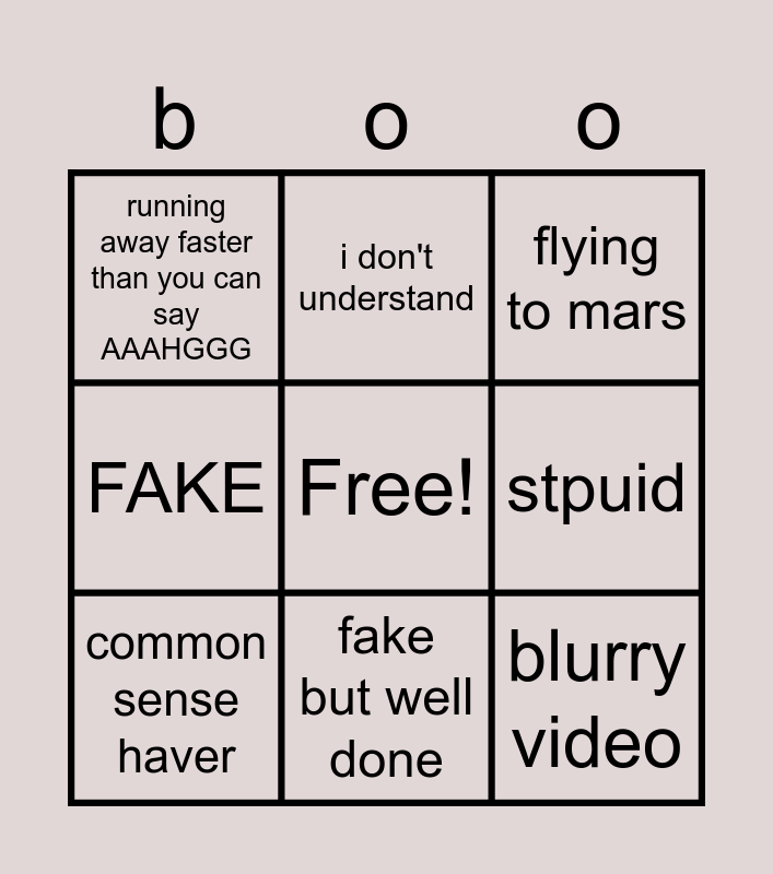 This bingo card has a free space and 8 words: stpuid, flying to mars, i don't understand, common sense haver, running away faster than you can say AAAHGGG, blurry video, FAKE and fake but well done.