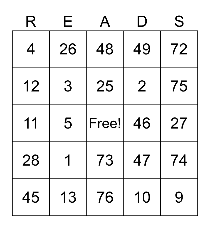 This bingo card has a free space and 24 words: 1, 13, 25, 45, 72, 4, 12, 26, 46, 73, 2, 11, 47, 74, 3, 10, 27, 48, 75, 5, 9, 28, 49 and 76.