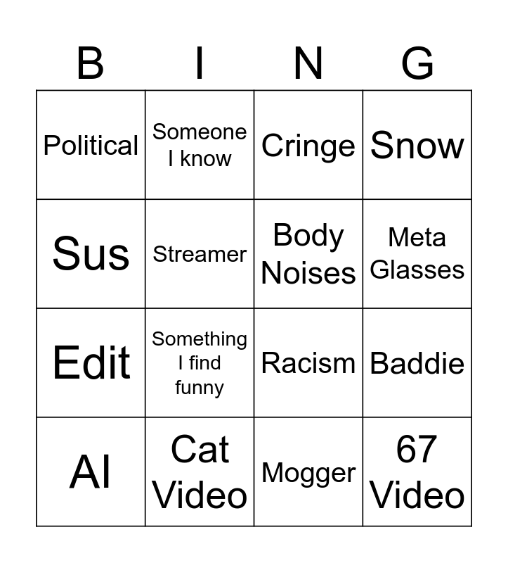 This bingo card has 16 words: Cat Video, Baddie, Cringe, Political, Edit, Someone I know, Racism, Mogger, Sus, Streamer, AI, Snow, Something I find funny, Meta Glasses, Body Noises and 67 Video.