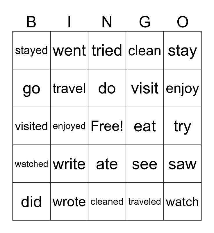 This bingo card has a free space and 24 words: write, wrote, do, did, stay, stayed, go, went, eat, ate, visit, visited, see, saw, travel, traveled, try, tried, enjoy, enjoyed, watch, watched, clean and cleaned.