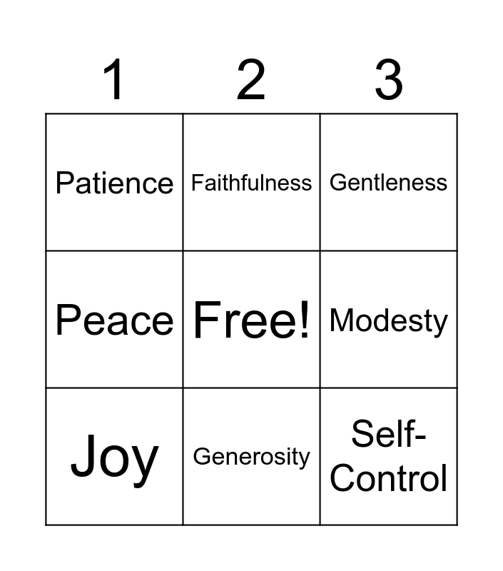 This bingo card has a free space and 12 words: Goodness, Chastity, Self-Control, Modesty, Faithfulness, Gentleness, Generosity, Kindness, Patience, Peace, Joy and Love.