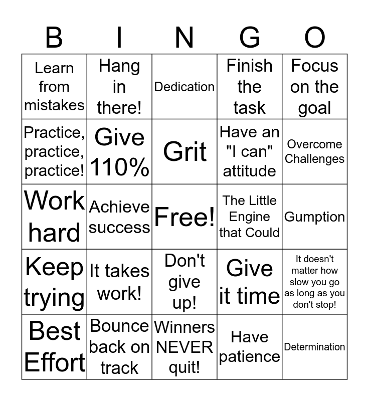 This bingo card has a free space and 24 words: It takes work!, Bounce back on track, Grit, Best Effort, Focus on the goal, Learn from mistakes, Practice, practice, practice!, Hang in there!, The Little Engine that Could, Don't give up!, Have an "I can" attitude, Work hard, Give it time, It doesn't matter how slow you go as long as you don't stop!, Give 110%, Have patience, Gumption, Dedication, Overcome Challenges, Achieve success, Determination, Keep trying, Finish the task and Winners NEVER quit!.