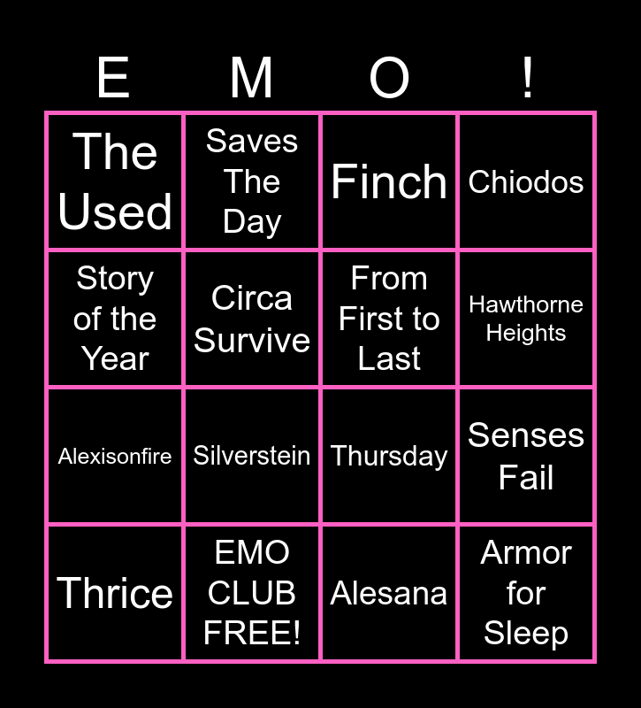 This bingo card has 20 words: Senses Fail, Saosin, Finch, Underoath, Thrice, Story of the Year, EMO CLUB FREE!, The Used, Alexisonfire, Saves The Day, Silverstein, Thursday, Circa Survive, Armor for Sleep, From First to Last, Emery, Hawthorne Heights, Chiodos, Alesana and Scary Kids Scaring Kids.