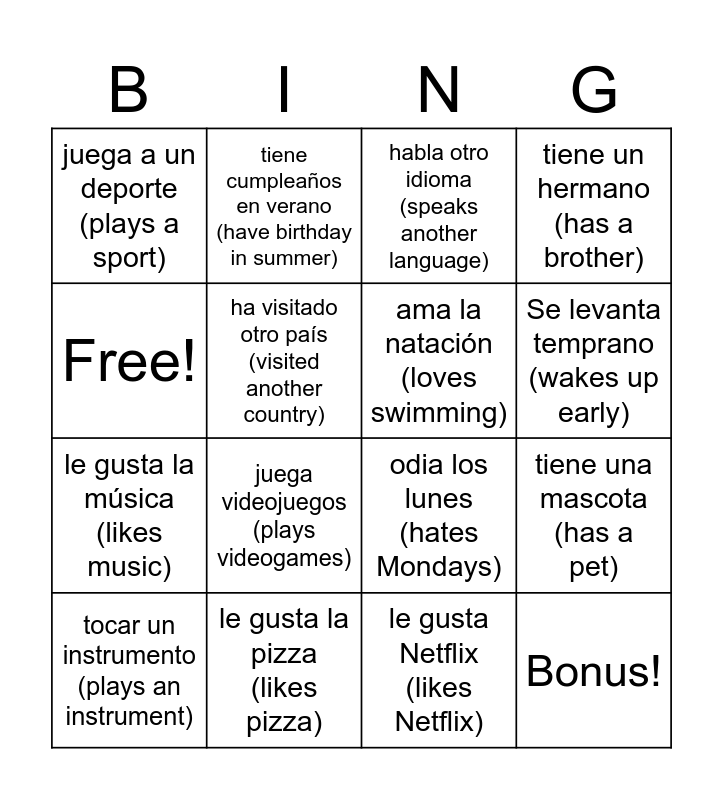 This bingo card has 16 words: le gusta la pizza (likes pizza), tiene una mascota (has a pet), habla otro idioma (speaks another language), juega a un deporte (plays a sport), le gusta la música (likes music), tiene cumpleaños en verano (have birthday in summer), odia los lunes (hates Mondays), le gusta Netflix (likes Netflix), Free!, ha visitado otro país (visited another country), tocar un instrumento (plays an instrument), tiene un hermano (has a brother), juega videojuegos (plays videogames), Se levanta temprano (wakes up early), ama la natación (loves swimming) and Bonus!.