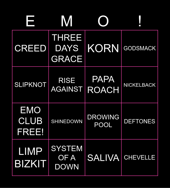 This bingo card has 20 words: DEFTONES, LINKIN PARK, KORN, NICKELBACK, LIMP BIZKIT, SLIPKNOT, SYSTEM OF A DOWN, CREED, EMO CLUB FREE!, THREE DAYS GRACE, SHINEDOWN, DROWING POOL, RISE AGAINST, CHEVELLE, PAPA ROACH, EVANESCENCE, NICKELBACK, GODSMACK, SALIVA and PUDDLE OF MUD.