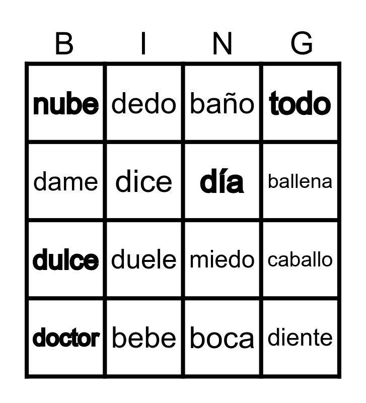 This bingo card has 16 words: bebe, caballo, baño, nube, dulce, dedo, miedo, boca, dame, dice, doctor, todo, duele, ballena, día and diente.