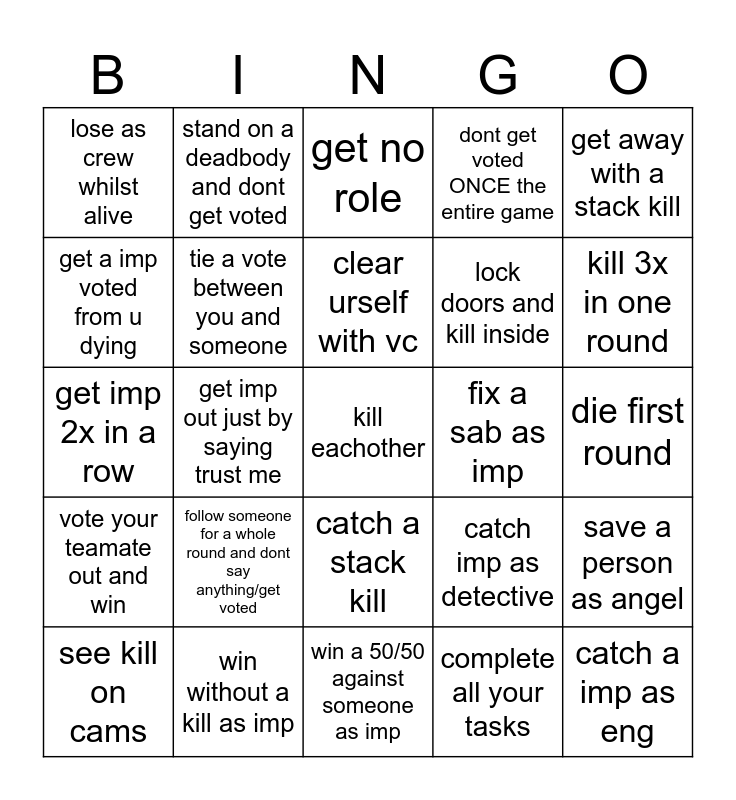 This bingo card has a free space and 27 words: catch imp as detective, catch someone phatom, lock doors and kill inside, win a 50/50 against someone as imp, get a imp voted from u dying, get no role, stand on a deadbody and dont get voted, vote your teamate out and win, fix a sab as imp, save a person as angel, get imp 2x in a row, dont get voted ONCE the entire game, see kill on cams, win without a kill as imp, kill 3x in one round, get an imp out without seeing them kill, tie a vote between you and someone, clear urself with vc, follow someone for a whole round and dont say anything/get voted, lose as crew whilst alive, die first round, complete all your tasks, get imp out just by saying trust me, catch a imp as eng, catch a stack kill, get away with a stack kill and 4 tasks in one round done.