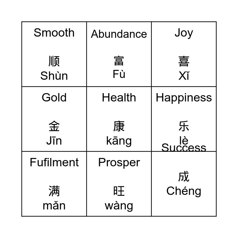 This bingo card has 18 words: Blessing 福 Fú, Wealth 财 Cái, Joy 喜 Xǐ, Smooth 顺 Shùn, Spring 春 Chūn, Gold 金 Jīn, Peace 安 Ān, Abundance 富 Fù, Prosper 旺 wàng, Success 成 Chéng, Thrive 兴 Xīng, Health 康 kāng, Reunion 团 Tuán, Happiness 乐 lè, Fufilment 满 mǎn, Horse 马 mǎ, Lantern 灯 dēng and Drum 鼓 gǔ.