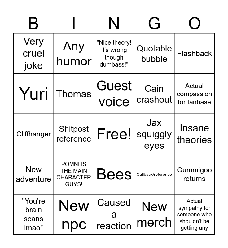 This bingo card has a free space and 24 words: POMNI IS THE MAIN CHARACTER GUYS!, New npc, Guest voice, "You're brain scans lmao", Flashback, Very cruel joke, Yuri, Any humor, Jax squiggly eyes, Bees, Cain crashout, Cliffhanger, Callback/reference, Gummigoo returns, Thomas, New merch, Insane theories, "Nice theory! It's wrong though dumbass!", Actual compassion for fanbase, Shitpost reference, Actual sympathy for someone who shouldn't be getting any, New adventure, Quotable bubble and Caused a reaction.