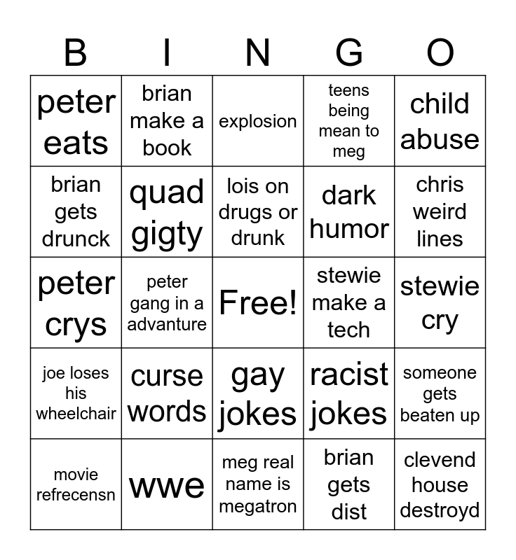 This bingo card has a free space and 24 words: curse words, wwe, lois on drugs or drunk, movie refrecensn, child abuse, peter eats, brian gets drunck, brian make a book, stewie make a tech, gay jokes, dark humor, peter crys, racist jokes, someone gets beaten up, quad gigty, brian gets dist, stewie cry, explosion, chris weird lines, peter gang in a advanture, clevend house destroyd, joe loses his wheelchair, teens being mean to meg and meg real name is megatron.