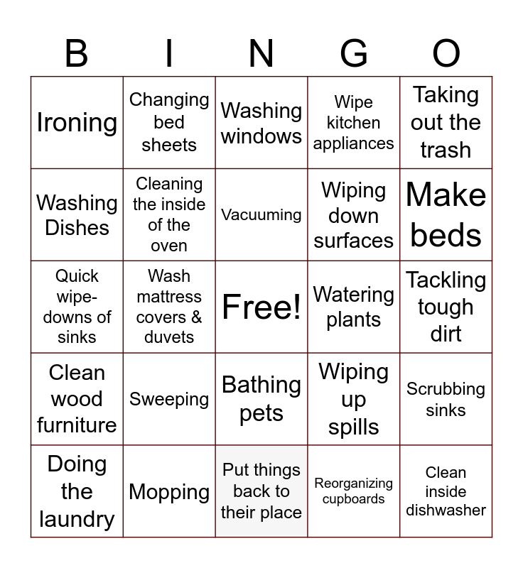 This bingo card has a free space and 24 words: Sweeping, Mopping, Vacuuming, Doing the laundry, Taking out the trash, Ironing, Washing Dishes, Changing bed sheets, Watering plants, Bathing pets, Wiping down surfaces, Quick wipe-downs of sinks, Wiping up spills, Scrubbing sinks, Cleaning the inside of the oven, Reorganizing cupboards, Tackling tough dirt, Washing windows, Make beds, Wash mattress covers & duvets, Clean inside dishwasher, Clean wood furniture, Wipe kitchen appliances and Put things back to their place.