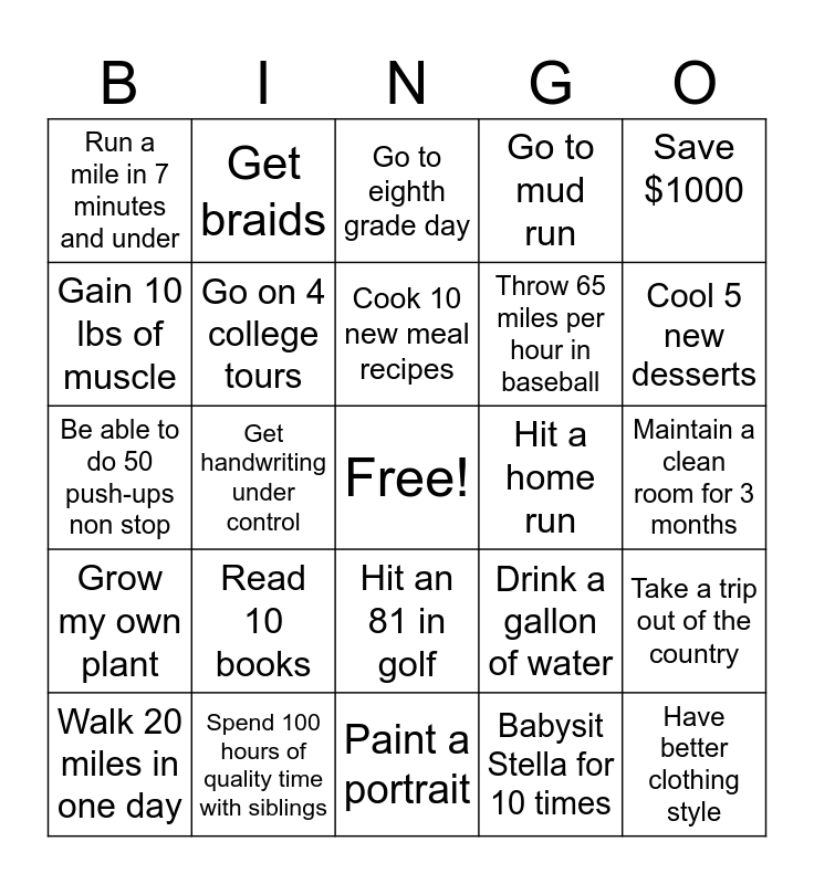 This bingo card has a free space and 24 words: Read 10 books, Spend 100 hours of quality time with siblings, Cook 10 new meal recipes, Walk 20 miles in one day, Save $1000, Run a mile in 7 minutes and under, Gain 10 lbs of muscle, Get braids, Hit a home run, Hit an 81 in golf, Throw 65 miles per hour in baseball, Be able to do 50 push-ups non stop, Drink a gallon of water, Take a trip out of the country, Go on 4 college tours, Babysit Stella for 10 times, Maintain a clean room for 3 months, Go to eighth grade day, Cool 5 new desserts, Get handwriting under control, Have better clothing style, Grow my own plant, Go to mud run and Paint a portrait.