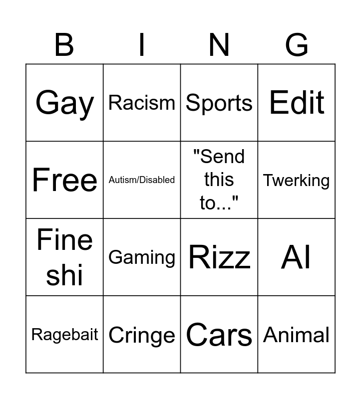 This bingo card has 16 words: Cringe, AI, Sports, Gay, Fine shi, Racism, Rizz, Cars, Free, Autism/Disabled, Ragebait, Edit, Gaming, Twerking, "Send this to..." and Animal.