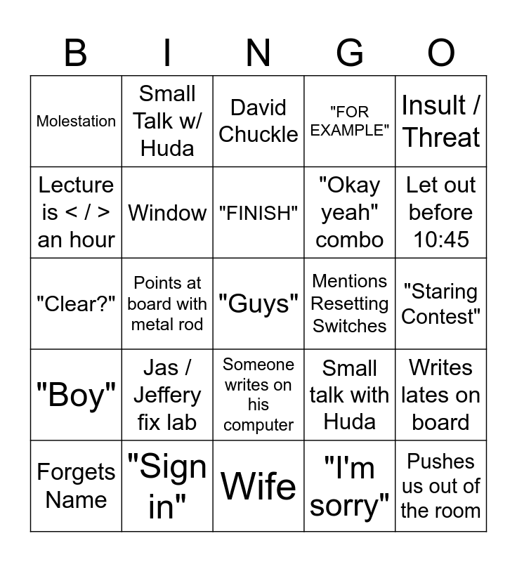 This bingo card has a free space and 29 words: Forgets Name, "WE are in IT", Points at board with metal rod, Hacked, Molestation, David Chuckle, Window, Jas / Jeffery fix lab, Mentions Resetting Switches, "Sign in", "Staring Contest", Pushes us out of the room, Wife, "I'm sorry", Let out before 10:45, Class starts at: _____, Someone writes on his computer, "Boy", Insult / Threat, "Clear?", Small talk with Huda, Mentions Jing Jing, "Okay yeah" combo, Lecture is < / > an hour, "FOR EXAMPLE", Small Talk w/ Huda, Writes lates on board, "FINISH" and "SHOW YOU".