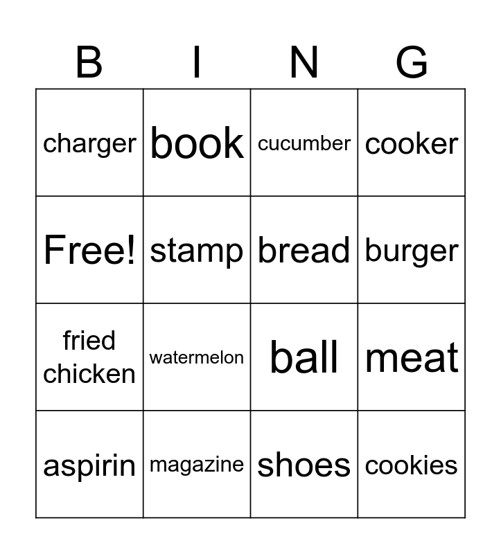This bingo card has 16 words: magazine, meat, cucumber, charger, fried chicken, book, ball, shoes, Free!, stamp, aspirin, cooker, watermelon, burger, bread and cookies.