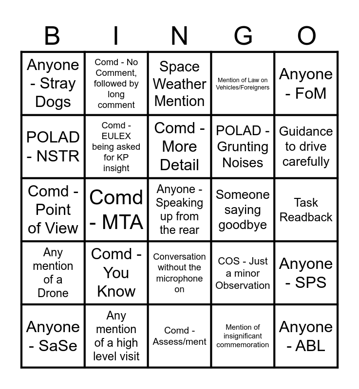 This bingo card has 25 words: Comd - You Know, Comd - Assess/ment, Comd - More Detail, Anyone - SaSe, Anyone - FoM, Anyone - Stray Dogs, POLAD - NSTR, Comd - No Comment, followed by long comment, Someone saying goodbye, Conversation without the microphone on, POLAD - Grunting Noises, Comd - Point of View, COS - Just a minor Observation, Anyone - SPS, Comd - EULEX being asked for KP insight, Anyone - ABL, Task Readback, Space Weather Mention, Guidance to drive carefully, Comd - MTA, Anyone - Speaking up from the rear, Any mention of a high level visit, Any mention of a Drone, Mention of Law on Vehicles/Foreigners and Mention of insignificant commemoration.