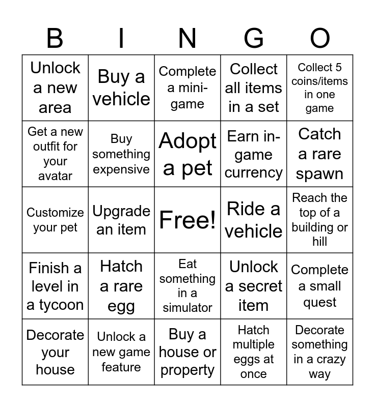 This bingo card has a free space and 25 words: Hatch a rare egg, Buy a house or property, Adopt a pet, Decorate your house, Collect 5 coins/items in one game, Unlock a new area, Get a new outfit for your avatar, Buy a vehicle, Ride a vehicle, Eat something in a simulator, Earn in-game currency, Customize your pet, Unlock a secret item, Complete a small quest, Buy something expensive, Find a hidden room, Reach the top of a building or hill, Complete a mini-game, Catch a rare spawn, Upgrade an item, Decorate something in a crazy way, Unlock a new game feature, Finish a level in a tycoon, Collect all items in a set and Hatch multiple eggs at once.