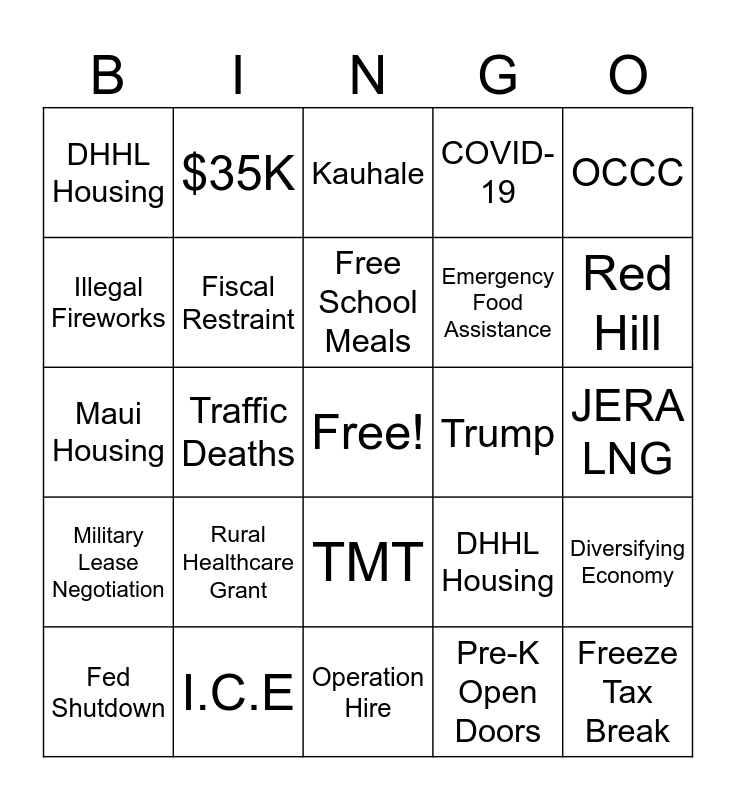 This bingo card has a free space and 27 words: DHHL Housing, Green Fee, Emergency Food Assistance, Operation Hire, Illegal Fireworks, Kauhale, $35K, Military Lease Negotiation, Trump, Diversifying Economy, Maui Housing, COVID-19, Fed Shutdown, I.C.E, Red Hill, Trump, Fiscal Restraint, Free School Meals, Rural Healthcare Grant, DHHL Housing, JERA LNG, Pre-K Open Doors, Traffic Deaths, Freeze Tax Break, TMT, OCCC and Film Industry.