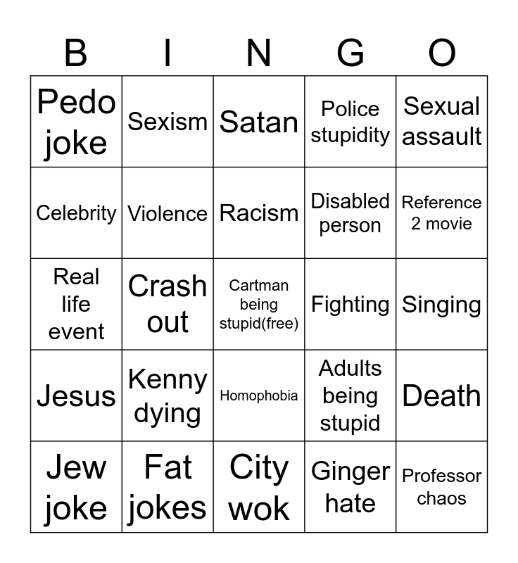 This bingo card has a free space and 24 words: Kenny dying, Fat jokes, Racism, Jew joke, Sexual assault, Pedo joke, Celebrity, Sexism, Fighting, Homophobia, Disabled person, Real life event, Adults being stupid, Death, Violence, Ginger hate, Singing, Satan, Reference 2 movie, Crash out, Professor chaos, Jesus, Police stupidity and City wok.