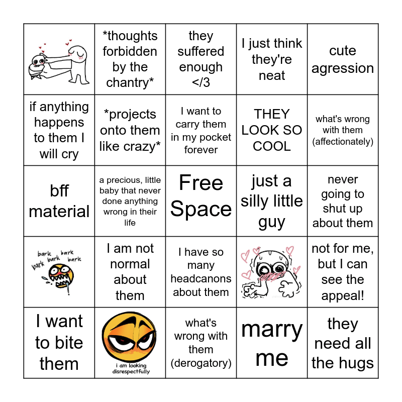 This bingo card has 4 images, a free space and 20 words: I am not normal about them, I want to carry them in my pocket forever, I want to bite them, cute agression, if anything happens to them I will cry, *thoughts forbidden by the chantry*, just a silly little guy, I have so many headcanons about them, THEY LOOK SO COOL, bff material, not for me, but I can see the appeal!, *projects onto them like crazy*, marry me, never going to shut up about them, they suffered enough </3, what's wrong with them (affectionately), a precious, little baby that never done anything wrong in their life, they need all the hugs, I just think they're neat and what's wrong with them (derogatory).