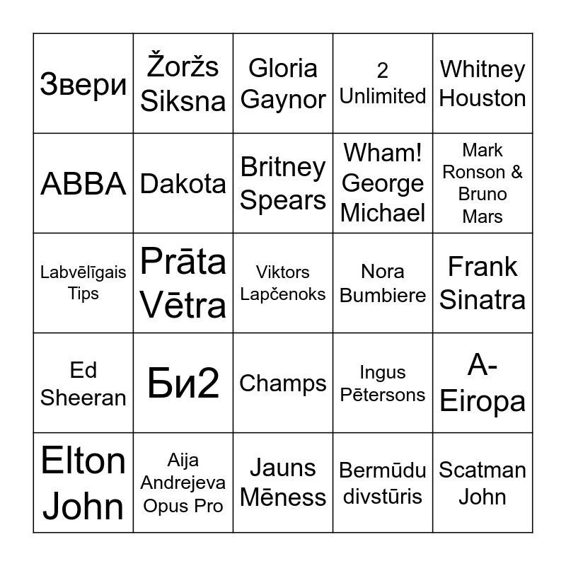 This bingo card has 35 words: Latgaliešu Tautasdziesma, Modern Talking, Юрий Никулин, Dakota, Champs, 2 Unlimited, ABBA, Oasis, Britney Spears, Bruģis, Labvēlīgais Tips, Whitney Houston, Верка Сердючка, Backstreet Boys, Звери, Nora Bumbiere, Bermūdu divstūris, Prāta Vētra, Ed Sheeran, Viktors Lapčenoks, Ingus Pētersons, Elton John, A-Eiropa, Aija Andrejeva Opus Pro, Gloria Gaynor, Mark Ronson & Bruno Mars, Scatman John, Руки Вверх!, Wham! George Michael, Frank Sinatra, Bon Jovi, Jauns Mēness, Би2, Žoržs Siksna and Kings Of Leon.