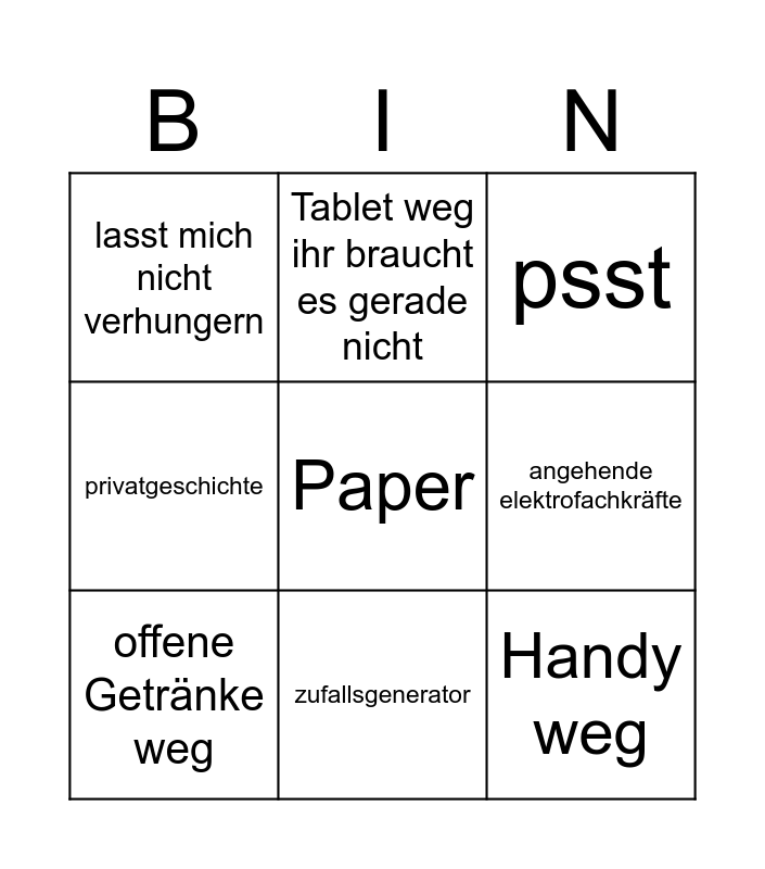 This bingo card has a free space and 8 words: angehende elektrofachkräfte, psst, Tablet weg ihr braucht es gerade nicht, offene Getränke weg, lasst mich nicht verhungern, Handy weg, privatgeschichte and zufallsgenerator.