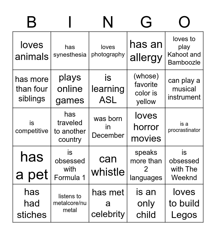 This bingo card has 25 words: is obsessed with Formula 1, has met a celebrity, is learning ASL, has had stiches, loves to play Kahoot and Bamboozle, loves animals, has more than four siblings, has synesthesia, loves horror movies, can whistle, (whose) favorite color is yellow, is competitive, speaks more than 2 languages, is obsessed with The Weeknd, plays online games, loves to build Legos, is a procrastinator, loves photography, can play a musical instrument, has traveled to another country, was born in December, listens to metalcore/nu metal, has a pet, has an allergy and is an only child.