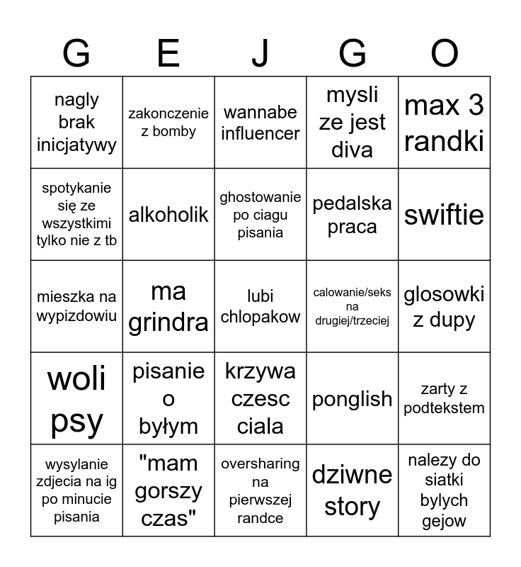 This bingo card has a free space and 24 words: pisanie o byłym, "mam gorszy czas", ghostowanie po ciagu pisania, wysylanie zdjecia na ig po minucie pisania, max 3 randki, nagly brak inicjatywy, spotykanie się ze wszystkimi tylko nie z tb, zakonczenie z bomby, calowanie/seks na drugiej/trzeciej, krzywa czesc ciala, pedalska praca, mieszka na wypizdowiu, ponglish, zarty z podtekstem, alkoholik, dziwne story, glosowki z dupy, wannabe influencer, swiftie, ma grindra, nalezy do siatki bylych gejow, woli psy, mysli ze jest diva and oversharing na pierwszej randce.
