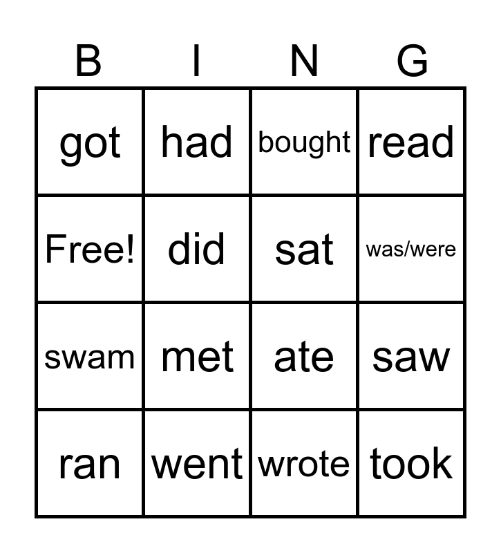 This bingo card has 16 words: went, saw, bought, got, swam, had, ate, wrote, Free!, did, ran, read, met, was/were, sat and took.
