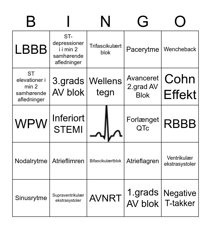 This bingo card has a free space and 24 words: Atrieflimren, Supraventrikulær ekstrasystoler, Wellens tegn, Sinusrytme, Wencheback, LBBB, ST elevationer i min 2 samhørende afledninger, ST-depressioner i i min 2 samhørende afledninger, Forlænget QTc, Bifascikulærtblok, Avanceret 2.grad AV Blok, WPW, Atrieflagren, Ventrikulær ekstrasystoler, 3.grads AV blok, 1.grads AV blok, RBBB, Trifascikulært blok, Cohn Effekt, Inferiort STEMI, Negative T-takker, Nodalrytme, Pacerytme and AVNRT.