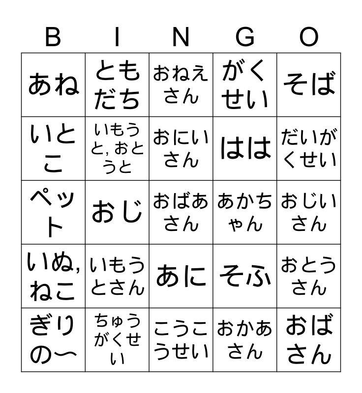 This bingo card has 28 words: おとうさん, ちち, はは, おかあさん, いとこ, おねえさん, ともだち, いぬ, ねこ, あかちゃん, ぎりの〜, ペット, がくせい, ちゅうがくせい, こうこうせい, だいがくせい, せいと, いもうとさん, いもうと, おとうと, おにいさん, あに, あね, おばさん, おばあさん, おじ, おじいさん, そふ, そば and きょうだい,..