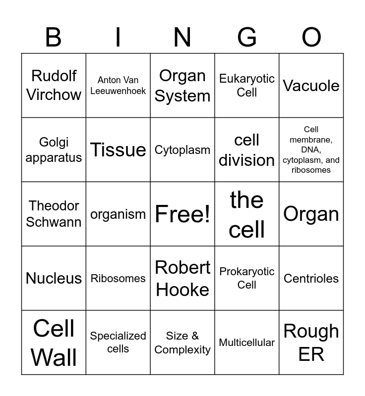 This bingo card has a free space and 24 words: Ribosomes, Specialized cells, Cytoplasm, Cell Wall, Vacuole, Rudolf Virchow, Golgi apparatus, Anton Van Leeuwenhoek, the cell, Robert Hooke, cell division, Theodor Schwann, Prokaryotic Cell, Centrioles, Tissue, Multicellular, Organ, Organ System, Cell membrane, DNA, cytoplasm, and ribosomes, organism, Rough ER, Nucleus, Eukaryotic Cell and Size & Complexity.