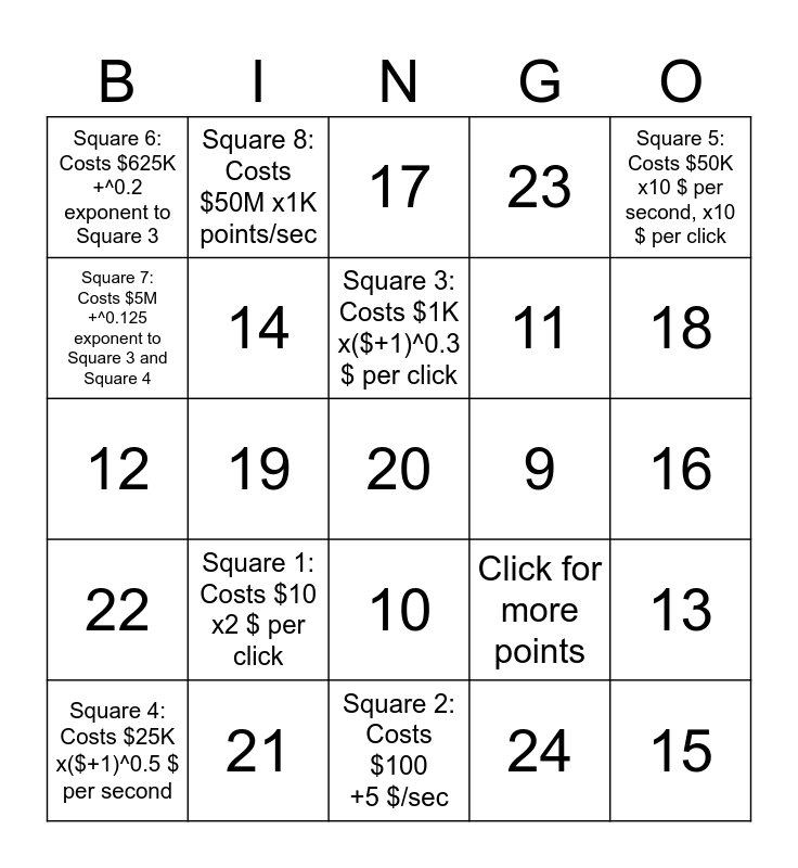 This bingo card has 25 words: Square 1: Costs $10 x2 $ per click, Square 2: Costs $100 +5 $/sec, Square 3: Costs $1K x($+1)^0.3 $ per click, Square 4: Costs $25K x($+1)^0.5 $ per second, Square 5: Costs $50K x10 $ per second, x10 $ per click, Square 6: Costs $625K +^0.2 exponent to Square 3, Square 7: Costs $5M +^0.125 exponent to Square 3 and Square 4, Square 8: Costs $50M x1K points/sec, 9, 10, 11, 12, Click for more points, 13, 14, 15, 16, 17, 18, 19, 20, 21, 22, 23 and 24.