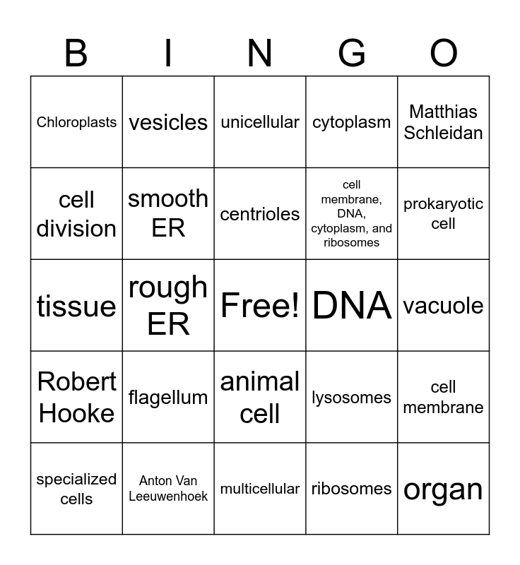 This bingo card has a free space and 24 words: flagellum, Anton Van Leeuwenhoek, centrioles, specialized cells, Matthias Schleidan, Chloroplasts, cell division, vesicles, DNA, animal cell, cell membrane, DNA, cytoplasm, and ribosomes, tissue, lysosomes, cell membrane, smooth ER, ribosomes, vacuole, unicellular, prokaryotic cell, rough ER, organ, Robert Hooke, cytoplasm and multicellular.