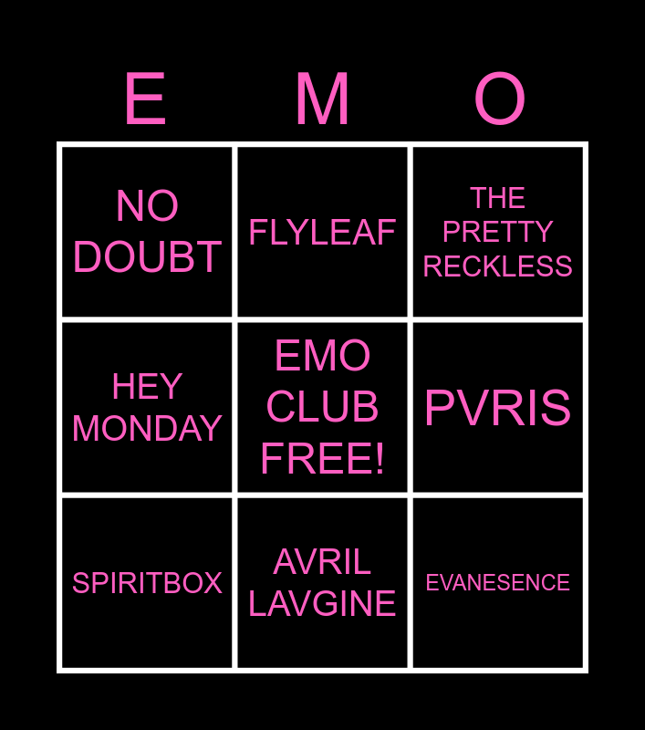 This bingo card has a free space and 11 words: PARAMORE, AVRIL LAVGINE, EVANESENCE, SPIRITBOX, FLYLEAF, THE PRETTY RECKLESS, PVRIS, THE VERONICAS, HEY MONDAY, NO DOUBT and IN THIS MOMENT.