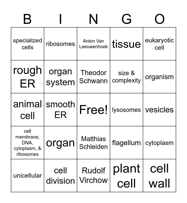 This bingo card has a free space and 24 words: organ, cell division, Theodor Schwann, unicellular, eukaryotic cell, specialized cells, rough ER, ribosomes, lysosomes, Matthias Schleiden, size & complexity, animal cell, flagellum, cytoplasm, organ system, plant cell, vesicles, Anton Van Leeuwenhoek, organism, smooth ER, cell wall, cell membrane, DNA, cytoplasm, & ribosomes, tissue and Rudolf Virchow.